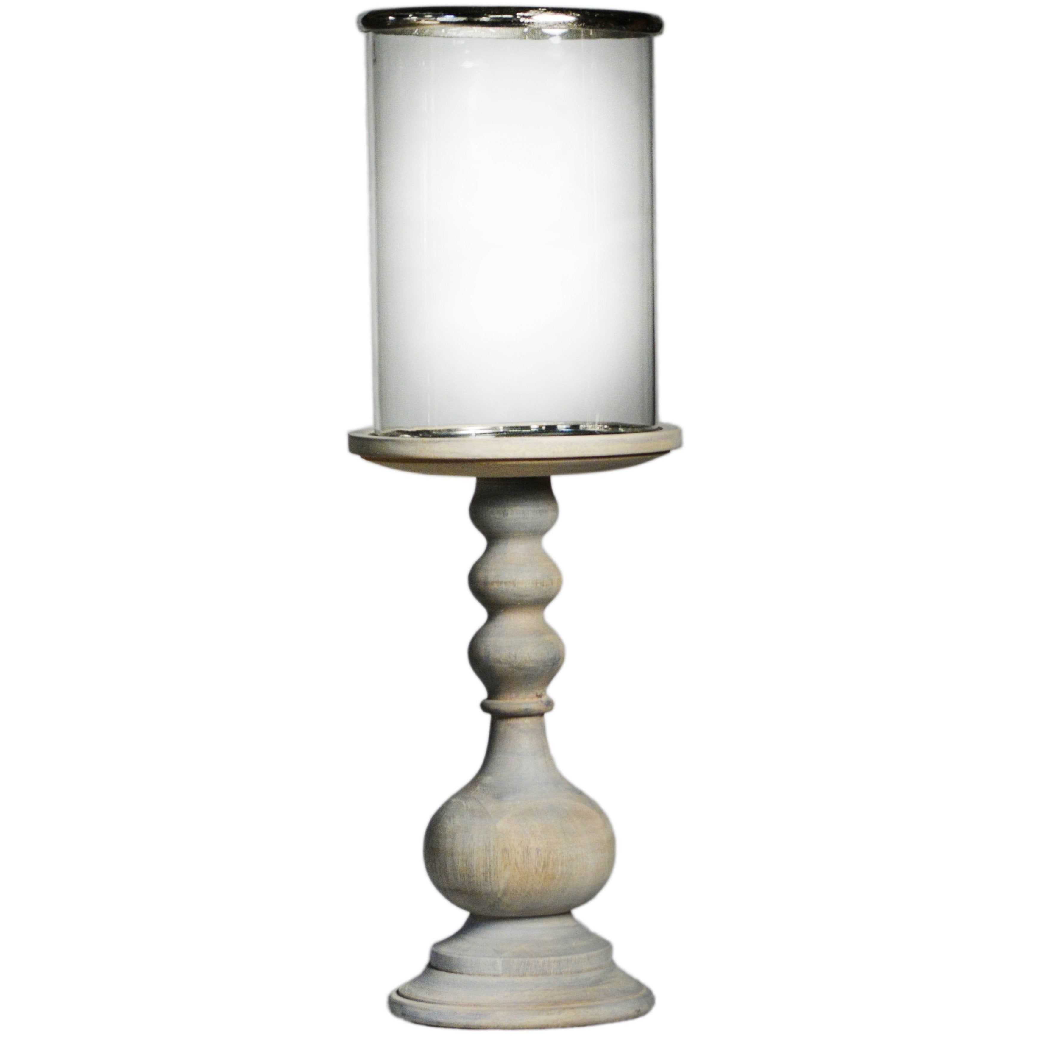 Add this gorgeous pillar candle holder to your space for a traditional-inspired design. Skillfully crafted in Indonesia using wood in a distressed light warm wash finish, featuring a stunning design that flaunts clean lines and subtle curves. Topped with clear cylinder glass that can hold a single candle.