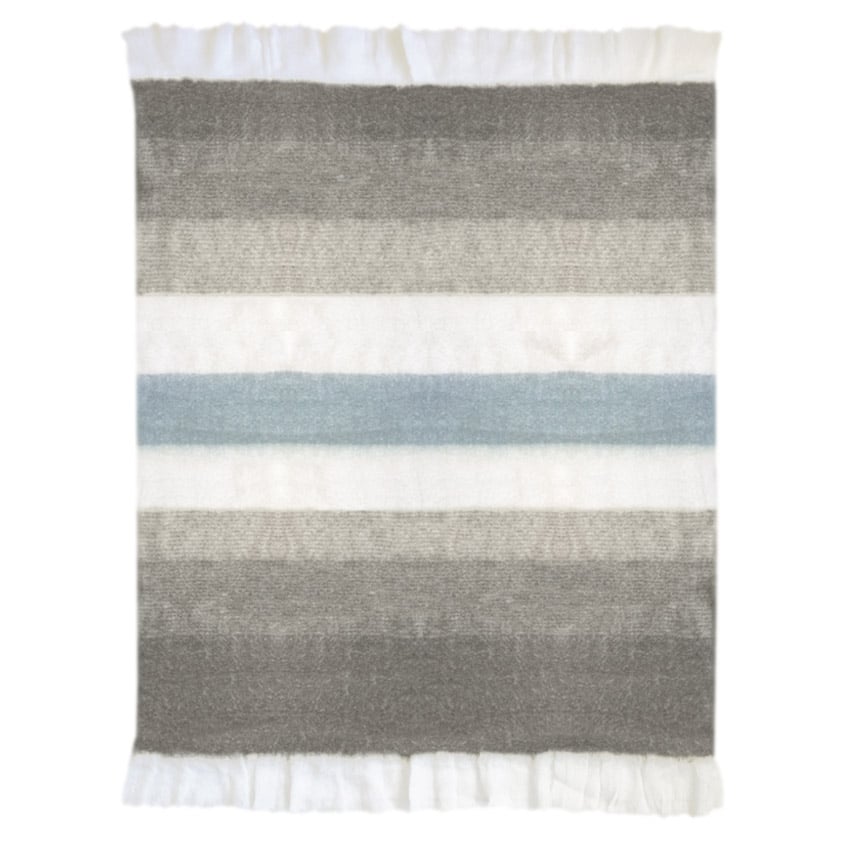 Perfect to toss on your favorite chair, sofa, or bed. Made with a clean and simple design, our soft and plush throw blanket features tassel trims on both ends. Cozy wool blended woven fabric in off white, grainy blue, and cool grey hues lend to the visual softness of this warm and luxurious blanket.