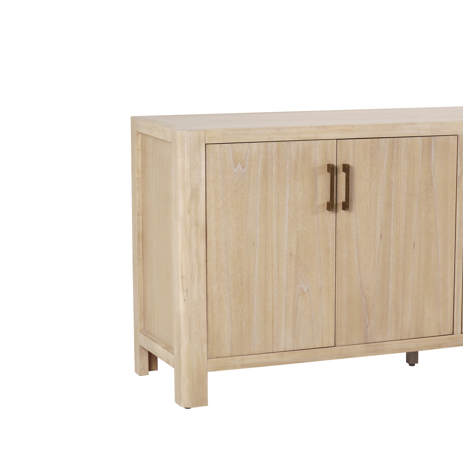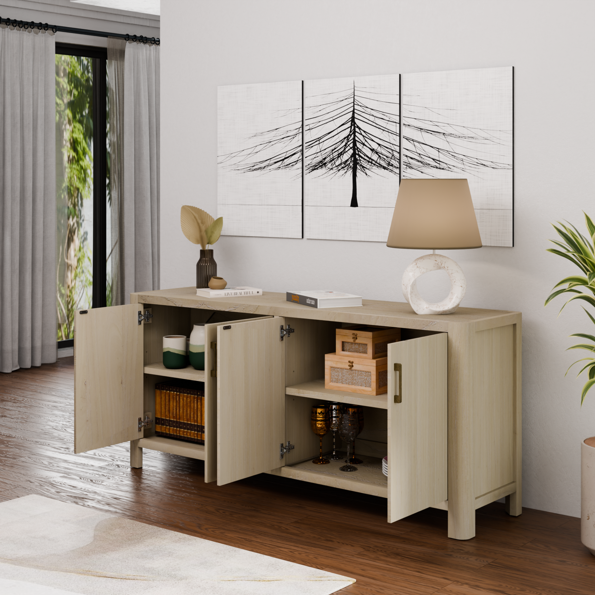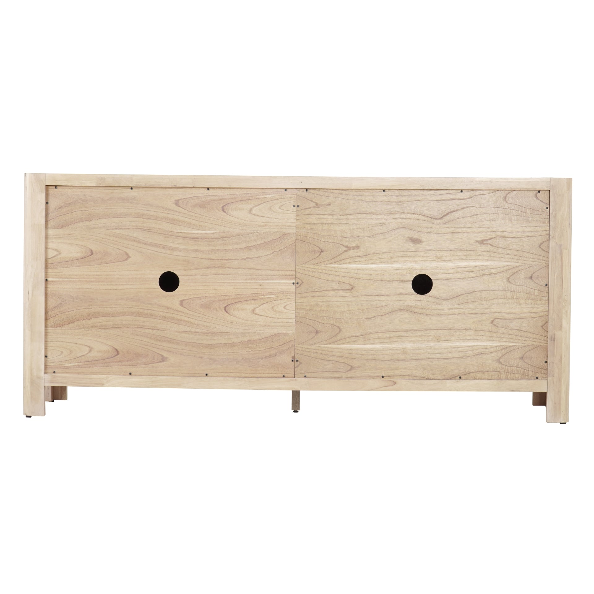 Designed with both style and practicality in mind, the Trevin Buffet features four spacious doors for ample storage, crafted from a combination of solid and engineered wood with a soft Mindi wood veneer finish that highlights its natural grain. Supported by sturdy solid wood legs, this piece ensures long-lasting durability, while adjustable plastic glides provide added floor protection and stability. Thoughtfully built for convenience, the buffet comes fully assembled, making it a seamless addition to any home.