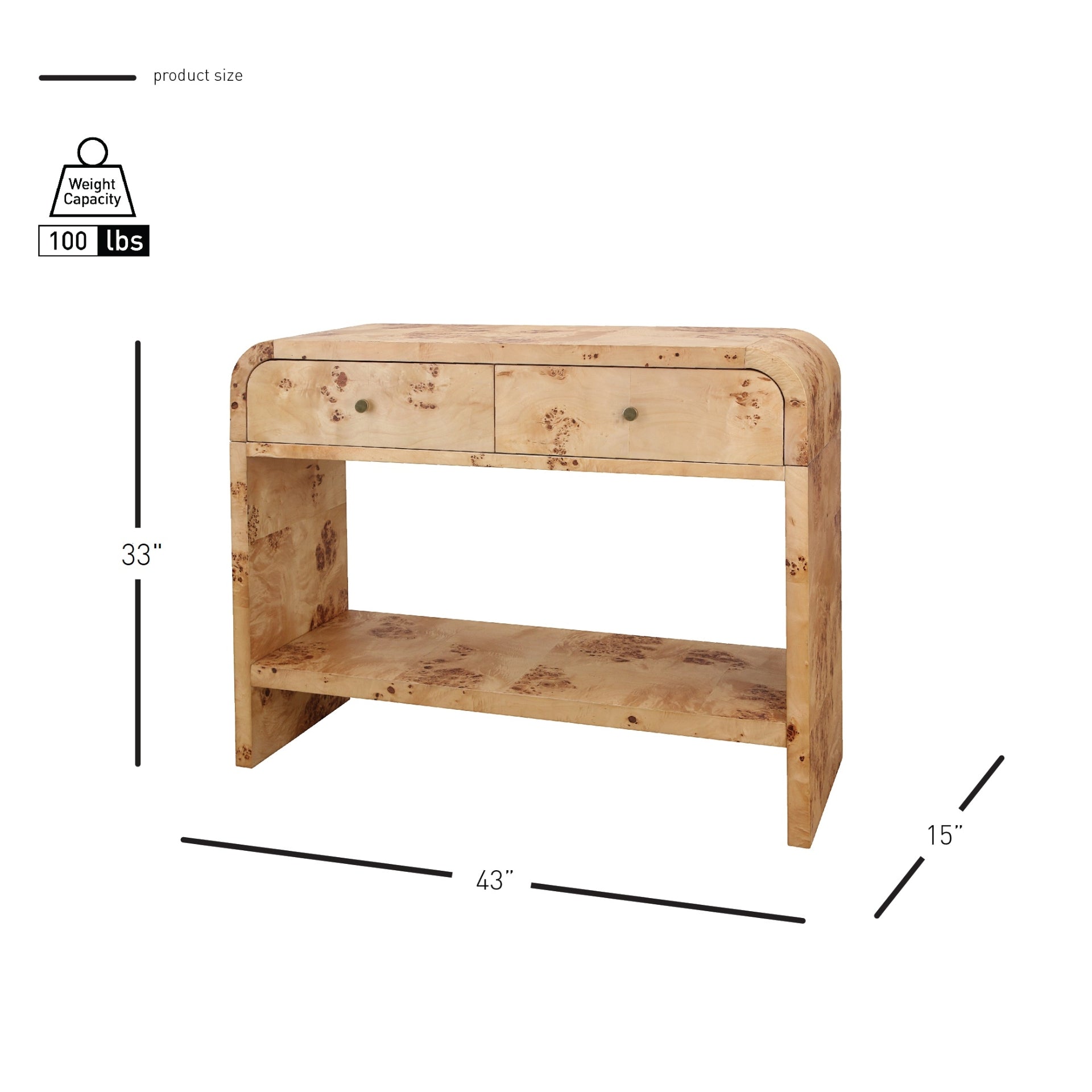 Expertly crafted from solid and engineered wood with a Mappa burlwood veneer, the Veyra pairs natural character with dependable structure. Sturdy legs provide sturdy support, while bronze-tone pulls add a refined accent against the organic burl pattern. Measuring 43" (W) x 15" (D) x 30" (H), it features two drawers on smooth roller glides plus a bottom open storage shelf for grab-and-go organization. Adjustable plastic glides help protect your floors and keep the table level—because wobble isn’t a design style.